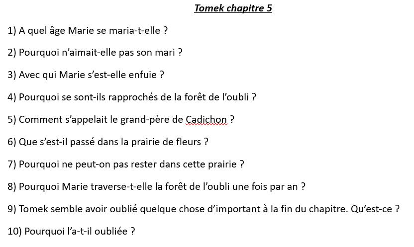 Groupe de lecture 2 : Finir de lire la page restante et répondre aux questions sur le chapitre 5 de Tomek.