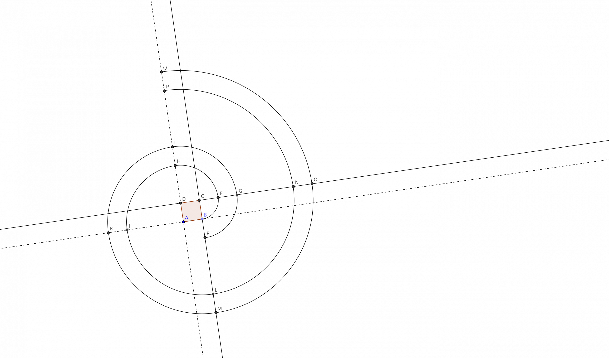 La deuxième étape consiste à tracer deux autres quarts de cercle, mais en prenant comme centre le point D. Le rayon de l’arc FH est la longueur DE. Et le rayon de l’arc GI est la longueur DG.