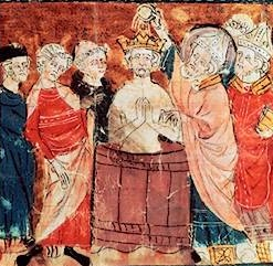 Cette image très ancienne (on l’appelle une miniature) date du XIVe siècle et raconte l’histoire du baptême de Clovis, un roi très important.